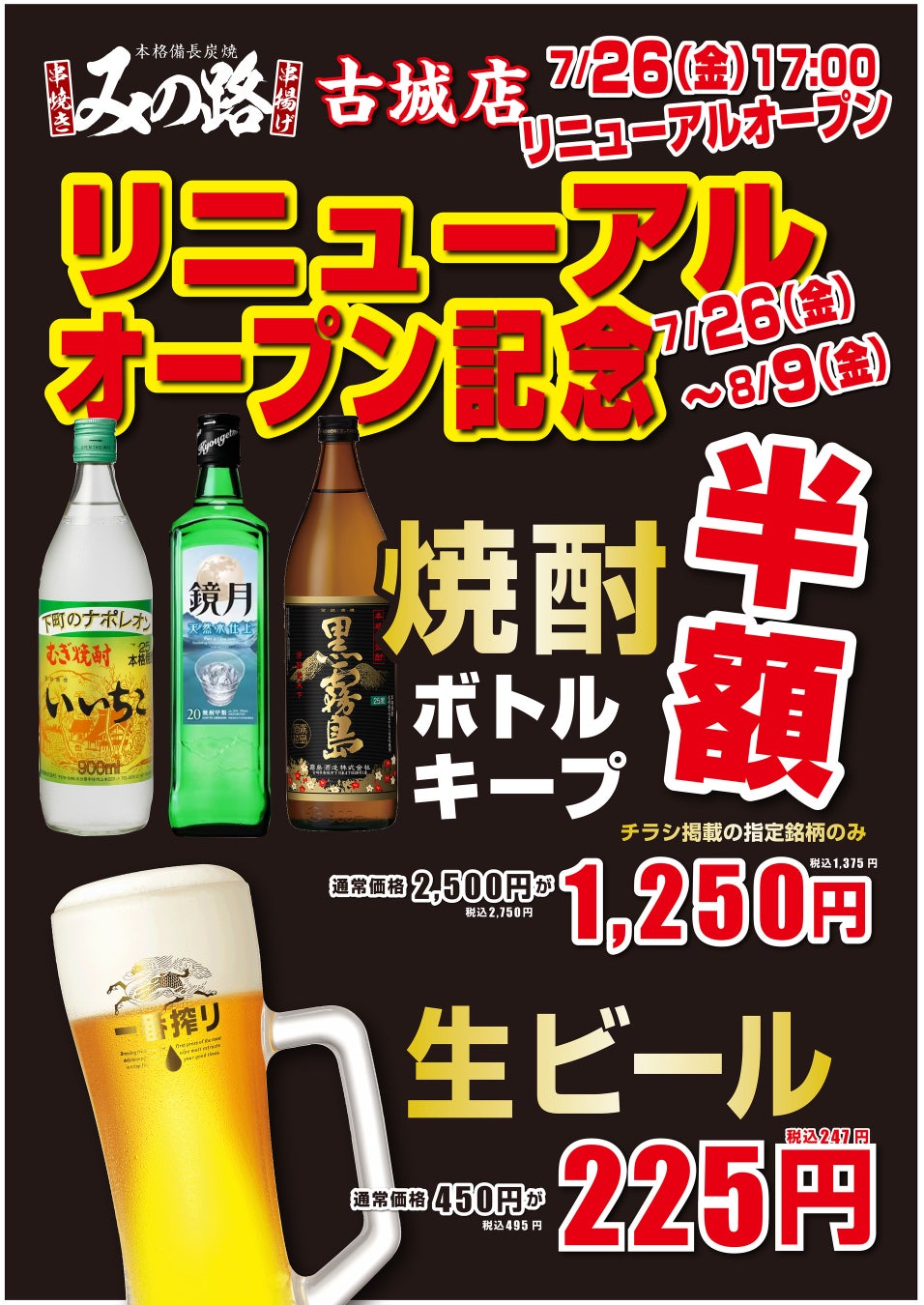 リニューアルオープン記念で8月9日(金)までは『生ビール半額』と『焼酎ボトルキープ半額』イベント開催します!