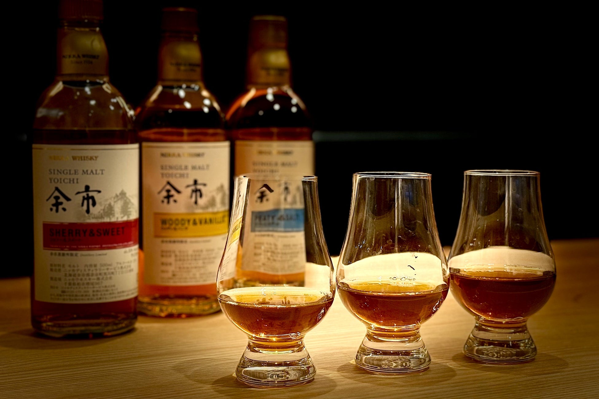 株式会社N・I(エヌアイ、本社:大阪府大阪市淀川区、代表取締役:河村 則夫)の運営する『純国産馬刺しと朝引き鶏 にほんいち』大阪堺筋本町店は、2025年2月10日(月)より、余市蒸溜所限定発売品の3種類(ウッディ&バニラ・ピーティー&ソルティ・シェリー&スイート)飲み比べの提供を4,500円(税込)でご提供いたします。