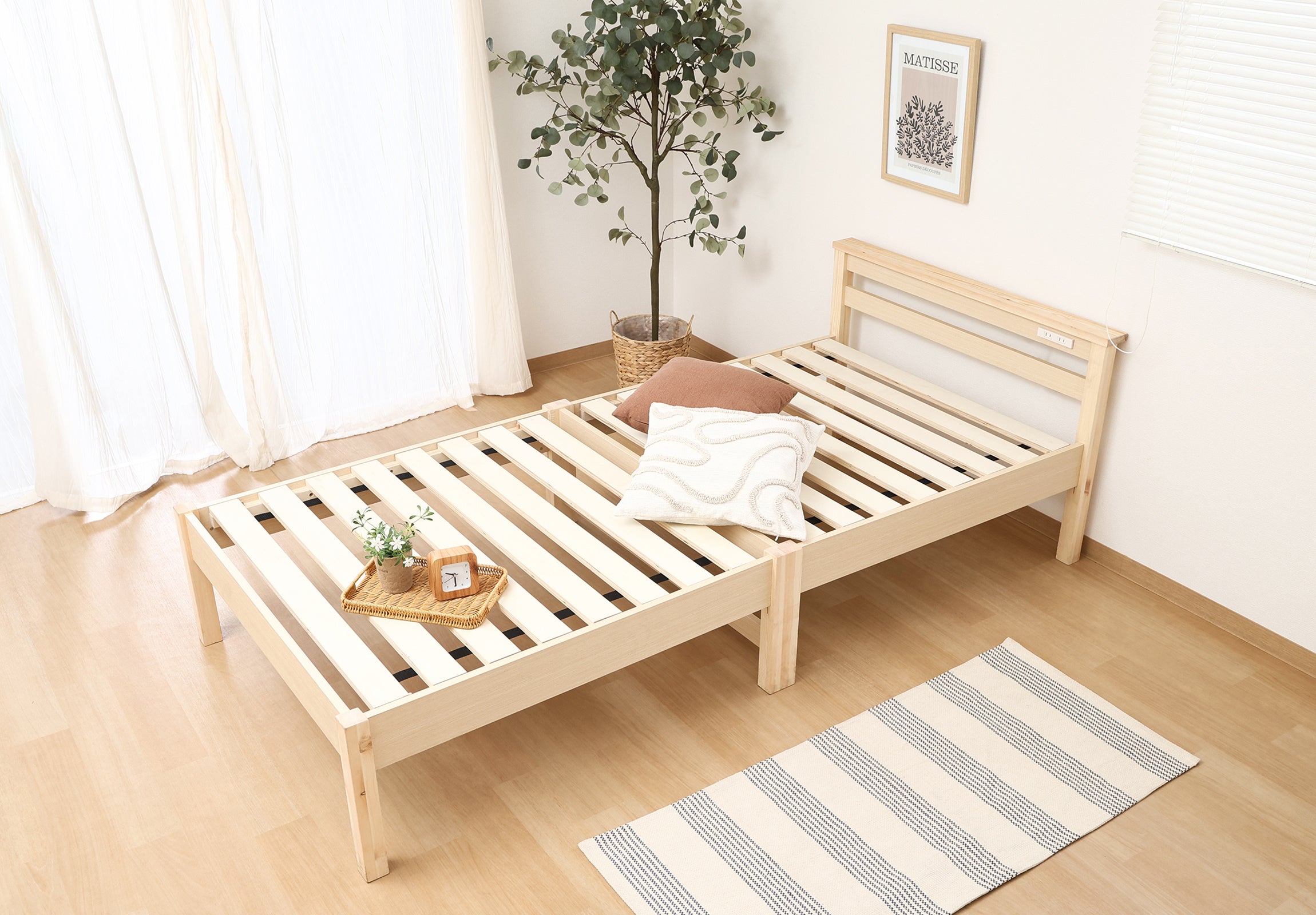 天然木パイン材のやさしい雰囲気で、シングル・セミダブルともに一人暮らしに使いやすいサイズ感。すのこ仕様で通気性がよく、ラッカー塗装でお手入れも簡単。枕元には2口コンセントを備え、充電やライトが便利に使えます。ベッド下は高さ24cmで収納力も十分。日常づかいをスマートに整える一台です。