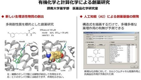 また、当研究室では、コンピュータを使ったインシリコ創薬研究も行っています。コンピュータは多様で大規模なデータを扱えるため、インシリコ創薬は医薬品研究の効率化につながる新しい技術として注目されています。有機化学とインシリコ技術の融合によるアカデミア創薬の実現という大きな夢を目標に研究を進めています。