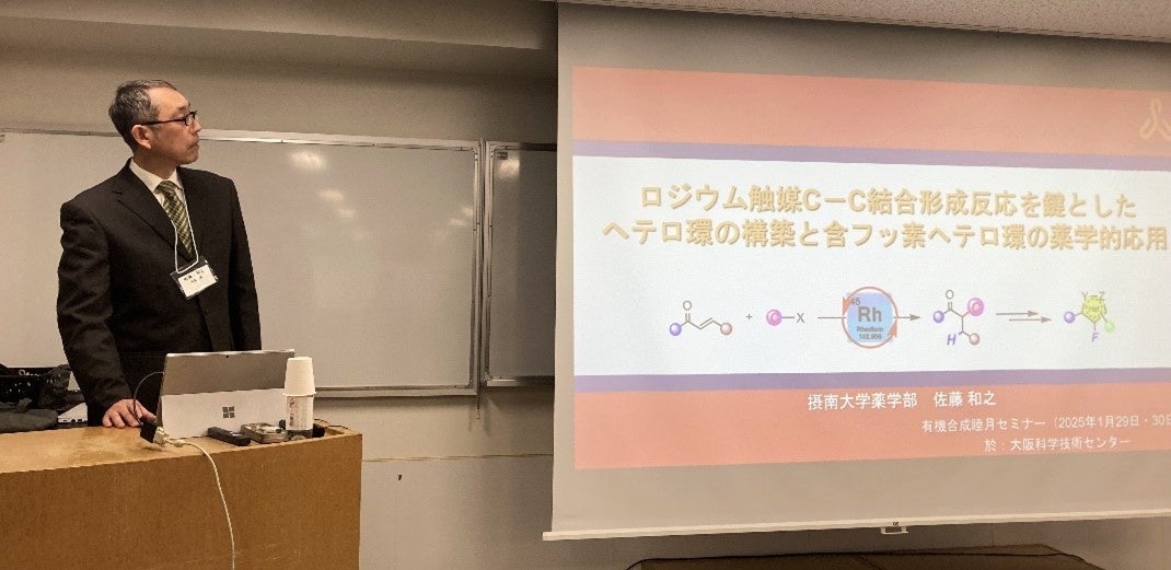 摂南大学(学長:久保康之)薬学部 医薬品化学研究室の佐藤和之准教授は、この度、公益社団法人有機合成化学協会関西支部(以下、有機合成化学協会関西支部)の、「第22回(2024年度)有機合成化学協会関西支部賞」を受賞しました。1月29日には、同支部主催のセミナーで受賞した研究題目についての講演を行いました。