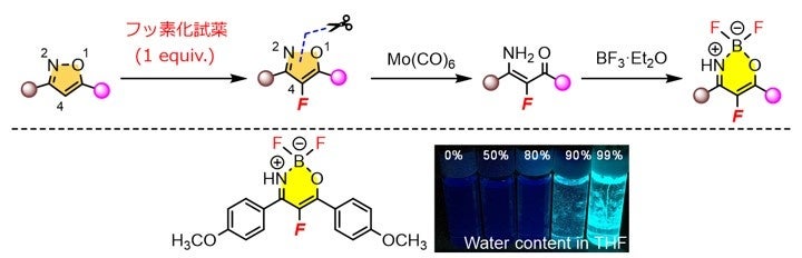 ヘテロ環の物理・化学的および生物学的な特性を変化させることを目的とし、創薬研究において重要な役割を果たしているイソキサゾールのフッ素化に着目。イソキサゾール4位への位置選択的なフッ素化では、引き続く N-O 結合の切断およびホウ素錯体化により凝集誘起型発光(AIE)特性を示す化合物の合成に成功した(図2)。
