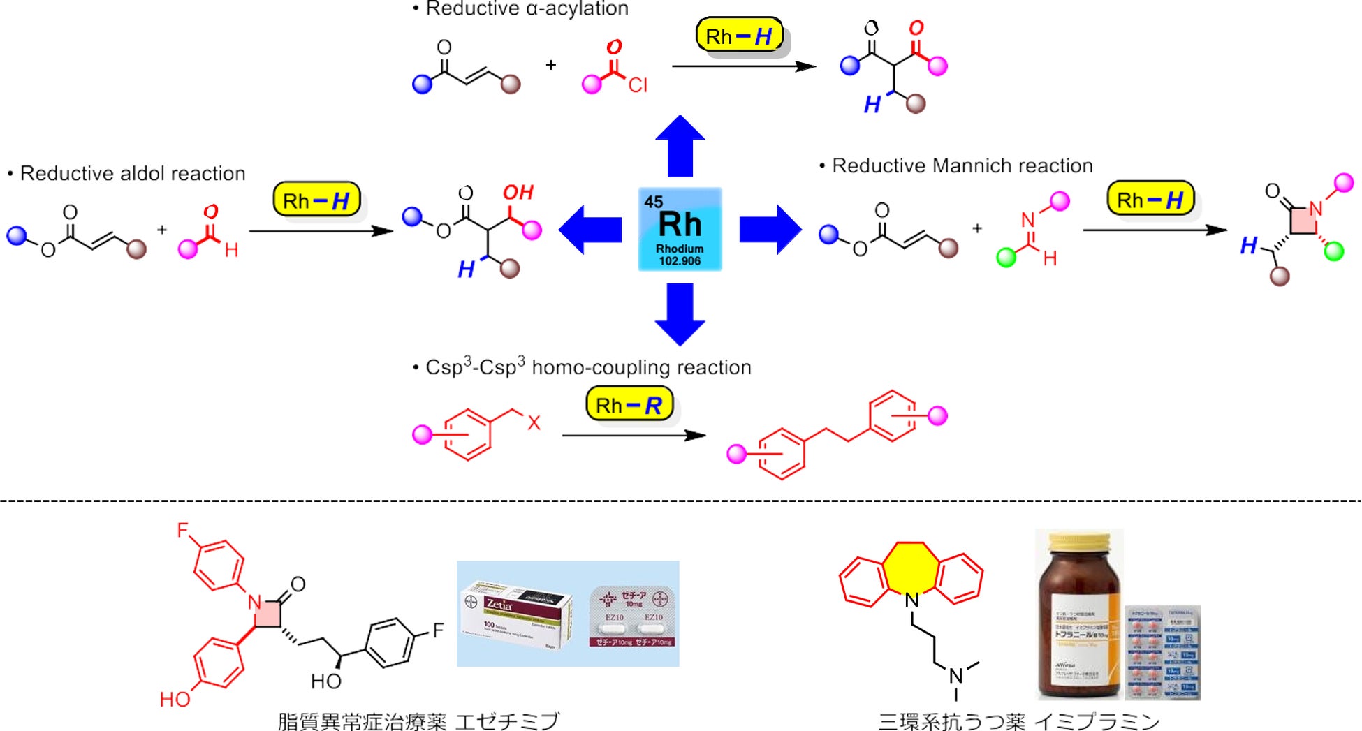 図 1. Rh錯体を介するC-C結合形成反応とそれを利用して合成した医薬品