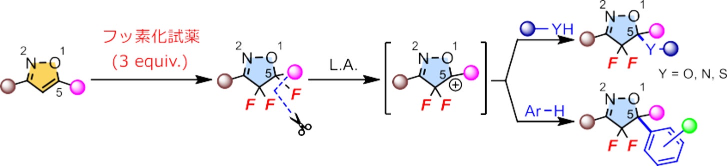イソキサゾールから導いた含フッ素イソキサゾリンでは、ルイス酸(L.A.)による処理でヘテロ環上の特定の位置にあるフッ素原子を選択的に切断することが可能であった。その結果、強固な C-F 結合の切断を足掛かりとした官能基変換に成功した(図3)。