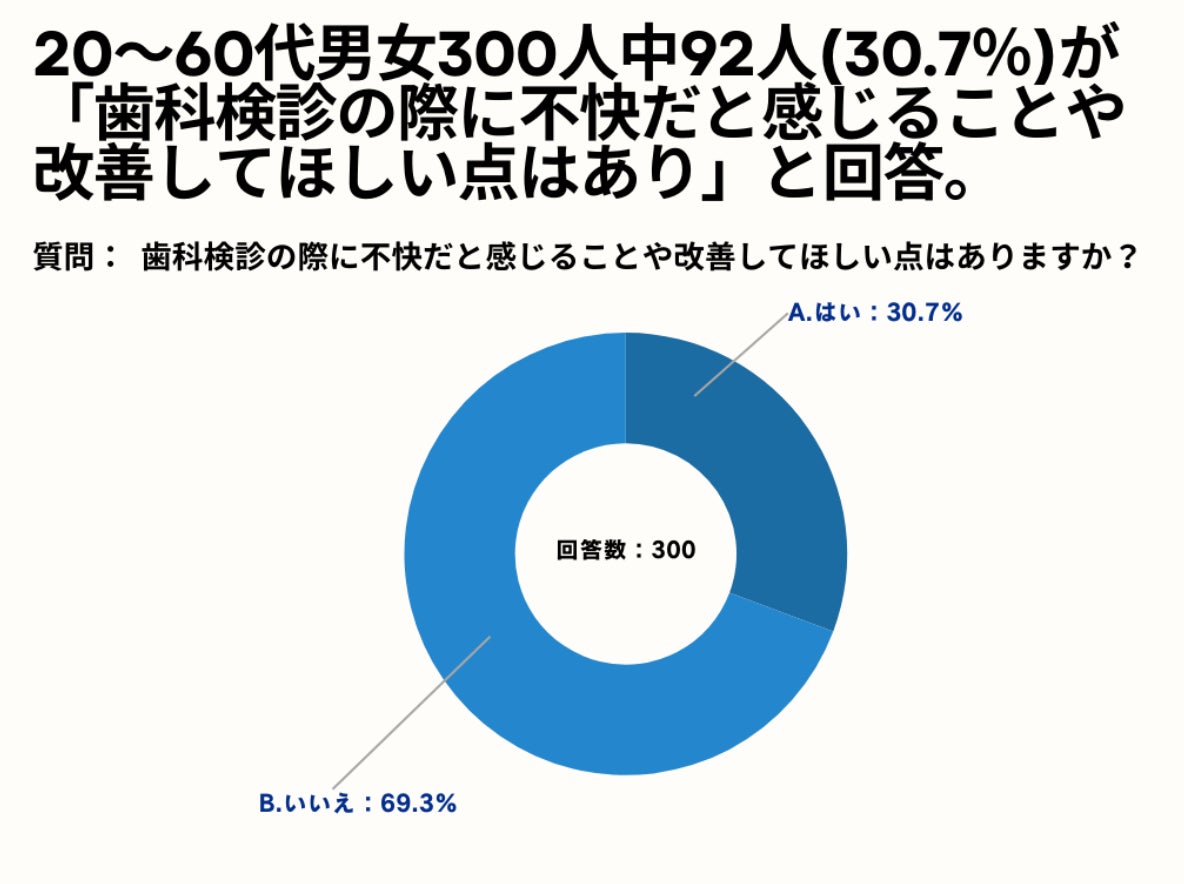 20~60代男女の30.7%が、歯科検診の際に「不快だと感じる、改善してほしい点がある」と回答。【歯科検診の体験に関するアンケート】