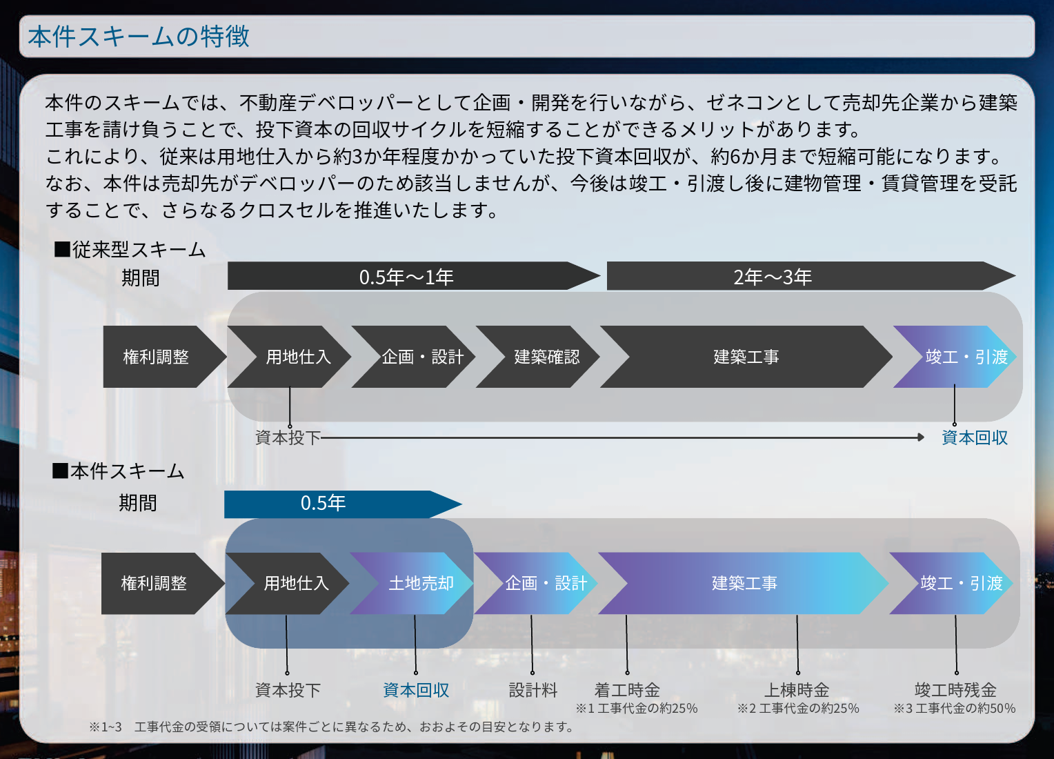 1販売用不動産の売却による売上、利益は 2026 年5月期第4四半期に計上予定です。 2建築工事請負による売上、利益は予定通りに工事が進んだ場合、建築工事予定期間中の2026年10月~2028年8月にわたって、工事進行基準に合わせて計上を見込んでおります。