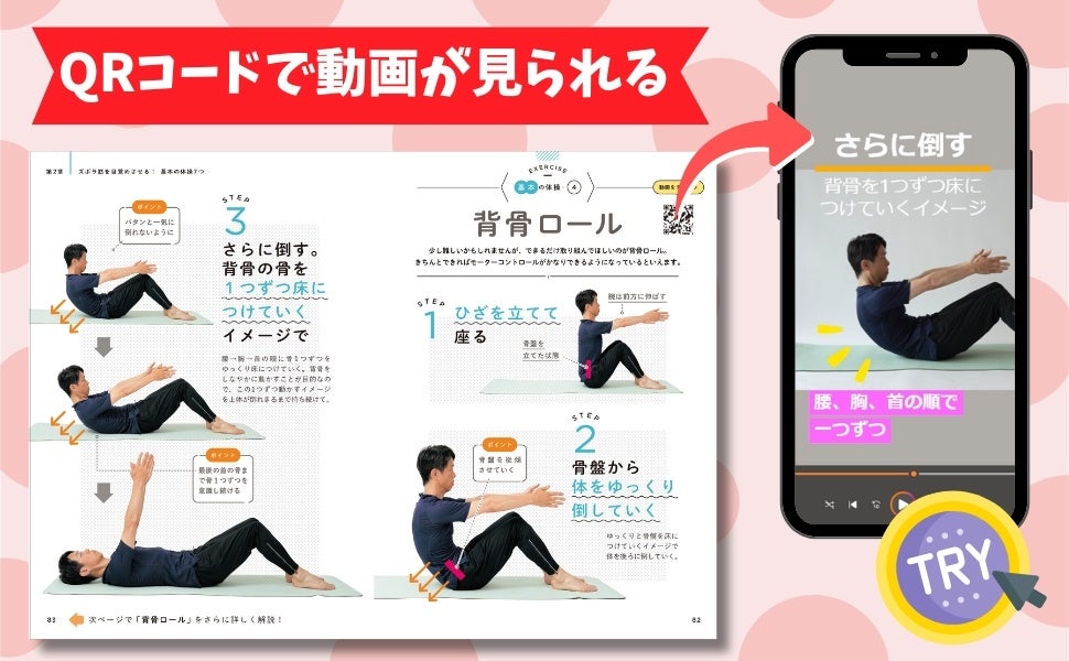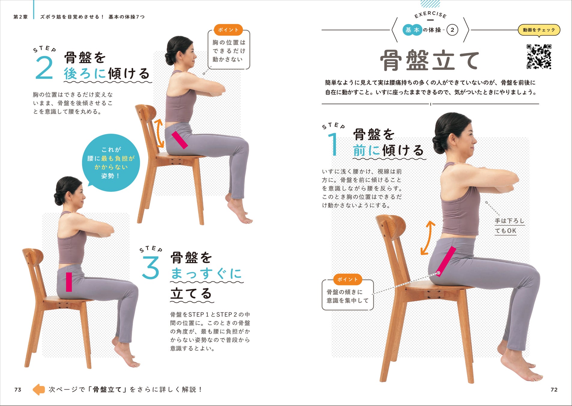 全ての体操はステップごとの写真でわかりやすく解説。骨盤の傾け方やポーズのイメージといったポイントを掲載しているので、はじめてでも簡単に実践できます。また、7つの体操についてはQRコードで見られる動画も提供。正しいやり方がマスターできます。