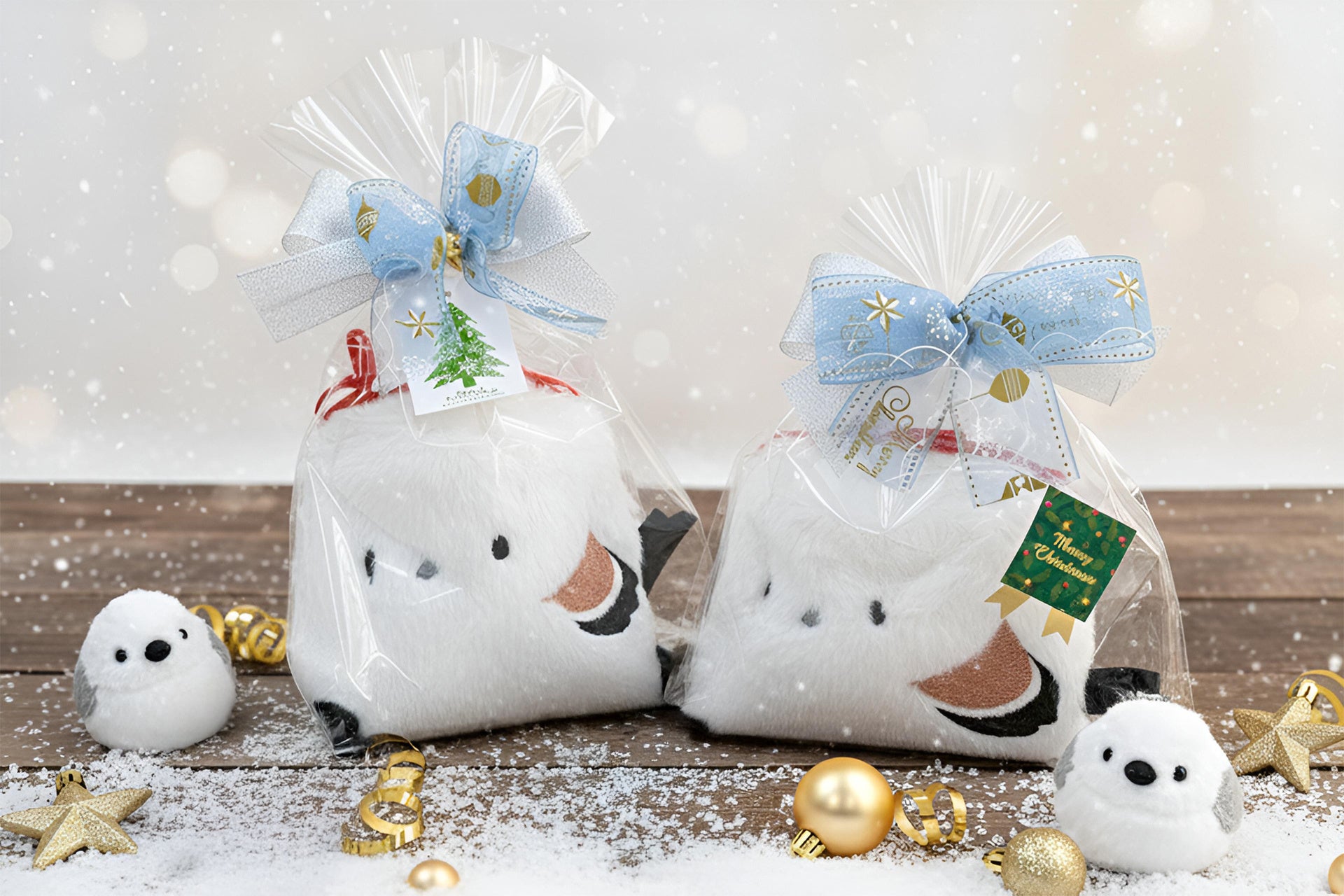 毛並みを再現したやわらかい素材に、愛くるしい顔を忠実に再現。特にポイントは、フェルトでできた尻尾と小さな足がポーチからちょこんと出ているところ。思わず抱きしめたくなる可愛さです。巾着の紐はクリスマスらしい赤で、季節感もばっちり。ラッピングは真っ白なシマエナガを、キラキラオーガンジーのブルーとシルバーのリボンで包み、見た目からも冬の魔法を感じられる仕上がりです。