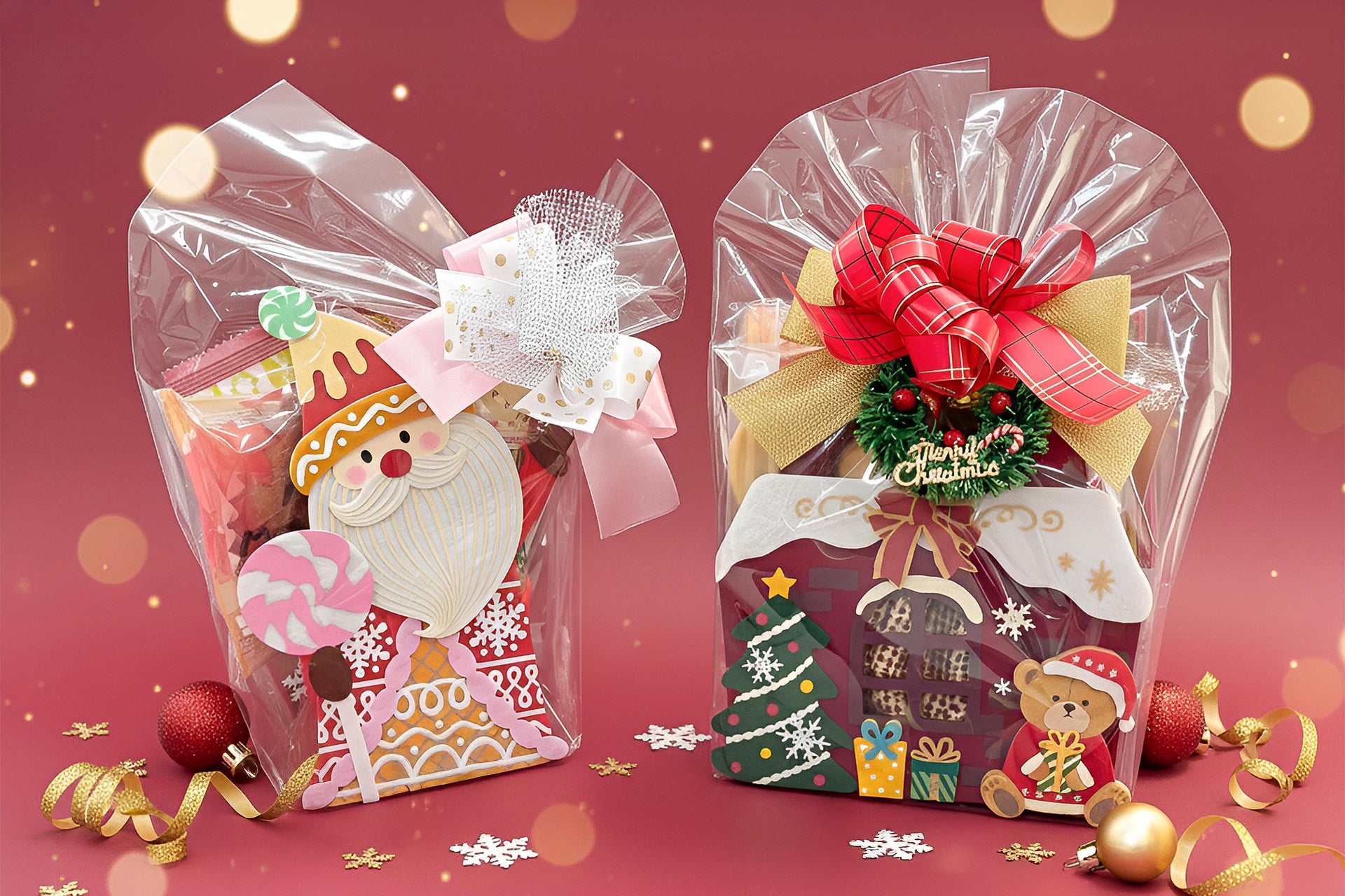 ガーリーな赤チェック柄のリボンに、大きく咲いた華やかなポインセチアを添え、“かわいさ”だけでなく“クリスマスの特別感”をギフト全体で表現しました。子どもはもちろん、大人だって胸が高鳴る――夢とおいしさをぎゅっと詰め込んだ仕立てです。