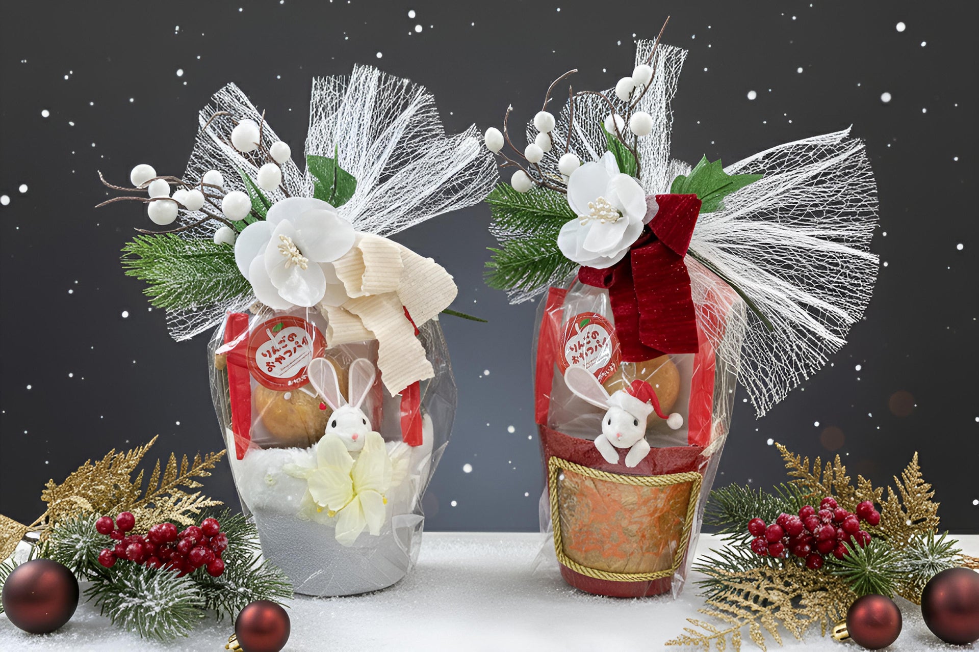 “うさぎ=りんご”のイメージから生まれた、甘酸っぱい林檎の「りんごのおやつパイ」。しっとりふわふわ、生地にメープルが香る「メープルマドレーヌ」。当店人気No.1の薄焼きチョコサンド「花彩菓」。そして、甘い余韻の合間に嬉しい塩味の「おせんべい」もセットに。味・素材・食感のコントラストまでも計算された、まさに“クリスマスの贅沢詰め合わせ”です。