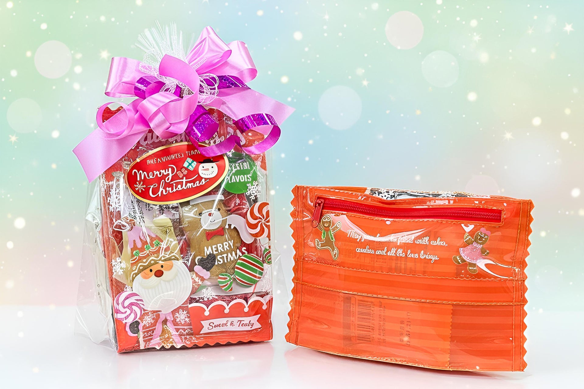 見た目はお菓子袋でも、後ろにはファスナー付きで、しっかり物を出し入れできる便利なポーチになっています。何を入れてもお菓子に見えちゃう不思議な魅力で、遊び心満点。スタッフも太鼓判を押すかわいさです。ラッピングには、ポーチの楽しさをさらに盛り上げるカーリングリボンを添えて、ポップで華やかな仕上がりに。