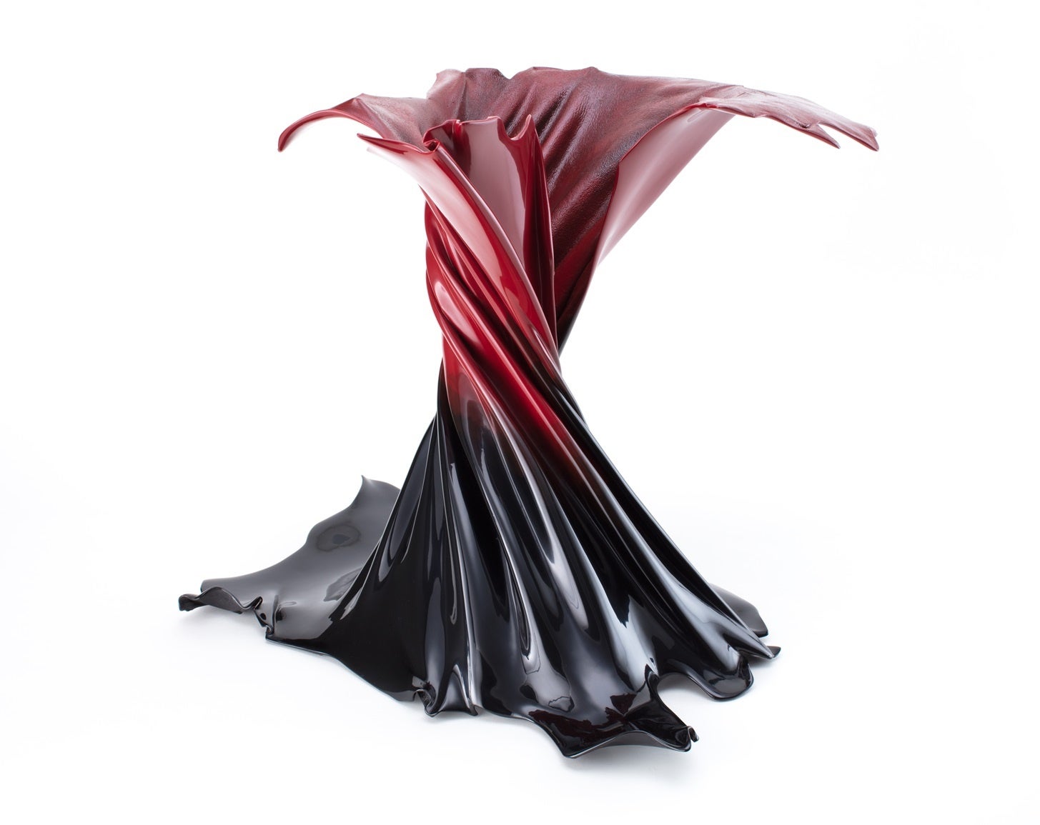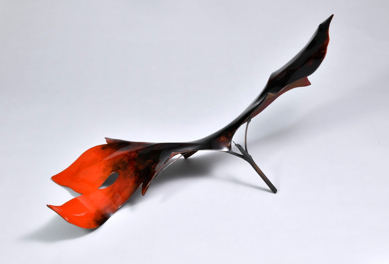 素材に皮革を用いて、造形の独自性や生命力など漆芸の新たな可能性を引き出している。作品は、革を引っ張り、皺を付ける制作過程の中で出会う偶発的な美しい曲面を漆で留めることにより、異彩を放つ豊かな造形を生み出す。色は漆を代表する艶があり奥深い黒とパワフルな赤を基調としている。革のしなやかさと漆の輝きを活かし、自然の美しさや力強さを作品に込め、花の開花や水の動きなど自然の神秘とエネルギーを表現している。