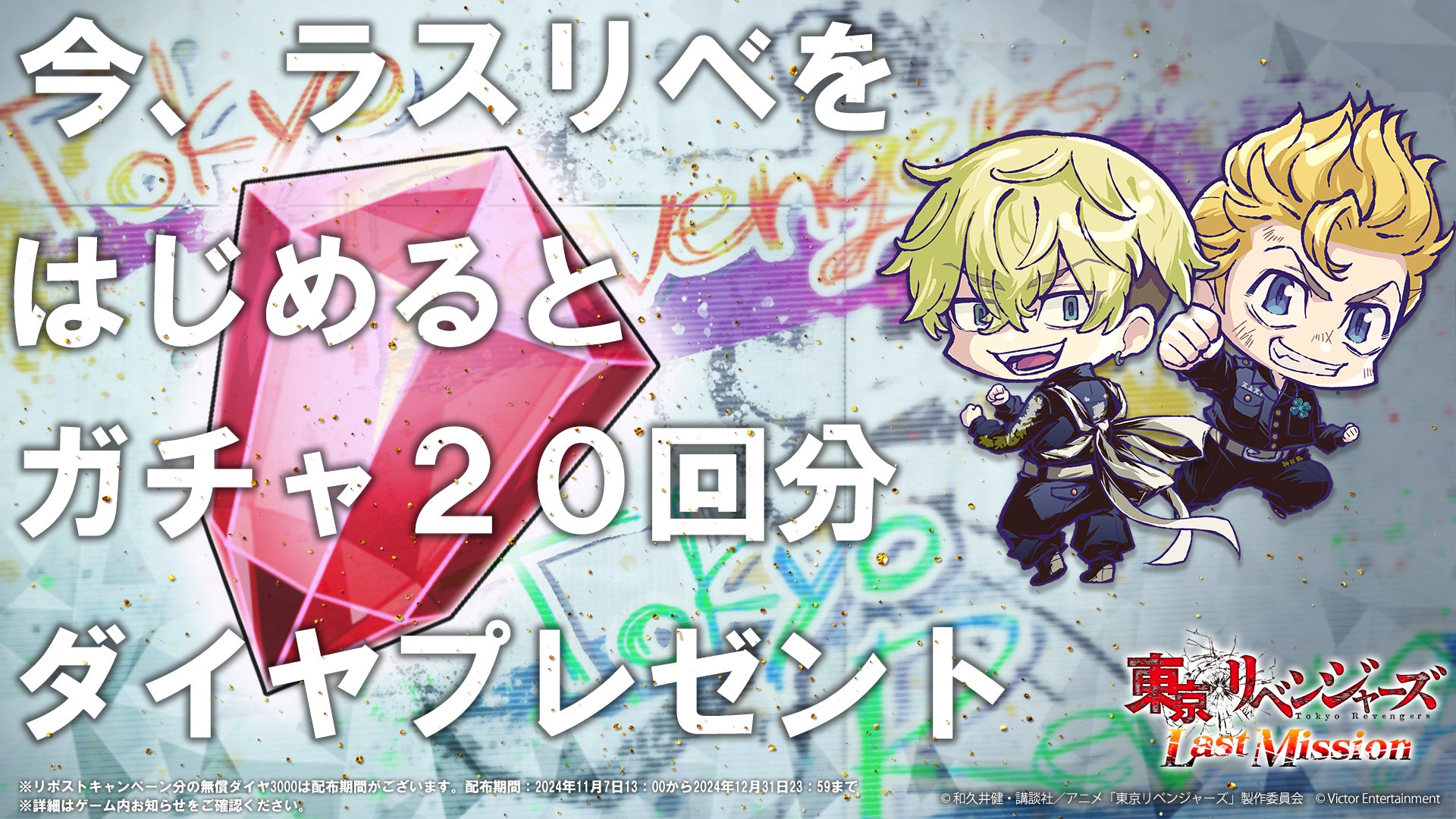 ビクターエンタテインメント株式会社(本社:東京都渋谷区、代表取締役社長:植田 勝教)は、TVアニメ『東京リベンジャーズ』初の3DアクションRPGである『東京リベンジャーズ Last Mission』(略称:ラスリベ)の正式サービスを11月7日より開始したことをお知らせいたします。