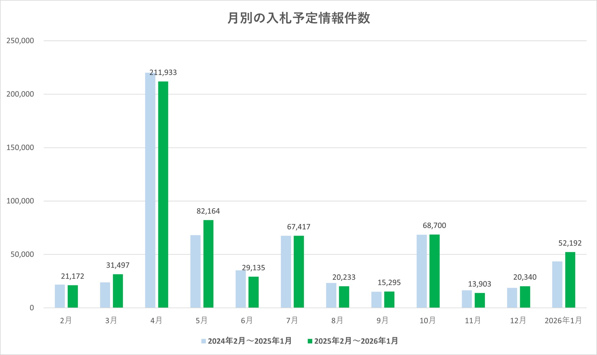 2026年1月の入札予定情報件数は52,192件でした。前月(2025年12月:20,340件)から31,852件の増加(前月比256.6%)となり、大幅に増加しました。前年同月(2025年1月:43,490件)と比較しても8,702件の増加(前年同月比120.0%)となっています。