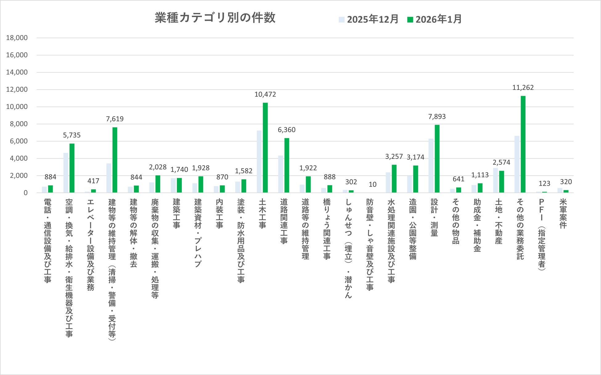 2026年1月の業種別入札件数では、多くのカテゴリで前月から増加が見られました。