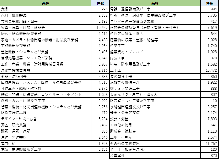 物品・機器系では、「家具・寝具・什器・備品等」が10,927件(前月比141.8%)、「文房具事務用品・図書」が5,635件(前月比158.2%)、「情報処理機器・ソフト及び業務」が7,141件(前月比139.0%)となりました。「事務機器及び業務」や「医療用機器・システム、医療・介護用品及び業務」でも増加が確認されています。