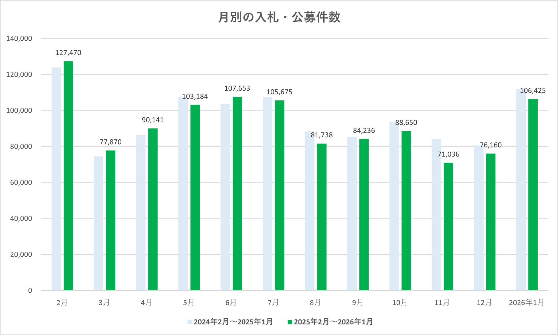 2026年1月の入札・公募件数は106,425件でした。前月(2025年12月:76,160件)から30,265件の増加(前月比139.8%)となり、年初に入り件数が大きく伸びました。11月の落ち込み以降、12月に持ち直し、1月はさらに増加して10万件台に回復しています。