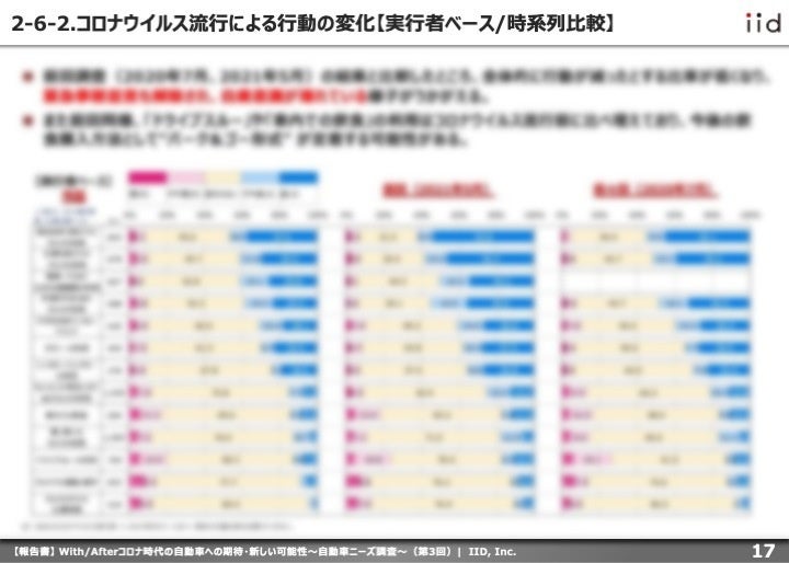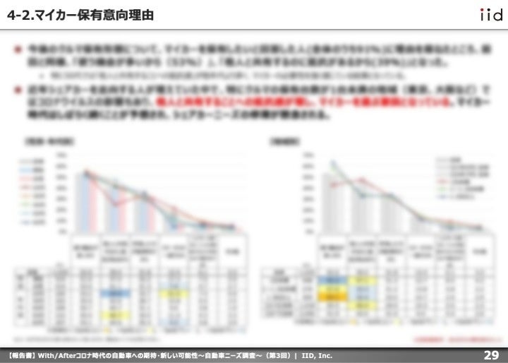 ・近年シェアカーを志向する人が増えていた中で、特にクルマの保有台数が1台未満の地域(東京、大阪など)ではコロナウイルスの影響もあり、他人と共有することへの抵抗感が増し、マイカーを選ぶ要因となっている。マイカー時代はしばらく続くことが予想され、シェアカーニーズの停滞が懸念される。