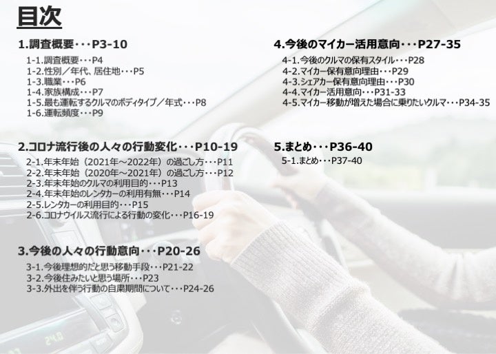 Withコロナ時代となった今、自動車の価値はどのように変化していくのか、継続的に調査を行い明らかにする(第1回:2020年7月、第2回:2021年5月)。今回の調査では、コロナ禍での年末年始の過ごし方、レンタカー利用についての設問を新たに加え、マイカーやレンタカーの活用に対する意識変化を見る。