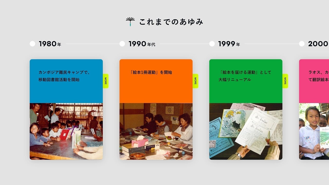 「絵本を届ける運動」が、最初は「絵本1冊運動」だったことを知っていますか? 1999年に「絵本を届ける運動」が始まるまでの経緯、国内で少しずつ広がっていった参加者の輪、そして国内外でどのように取り組みが広がっていったのか、これまでのあゆみを時系列で知ることができます。