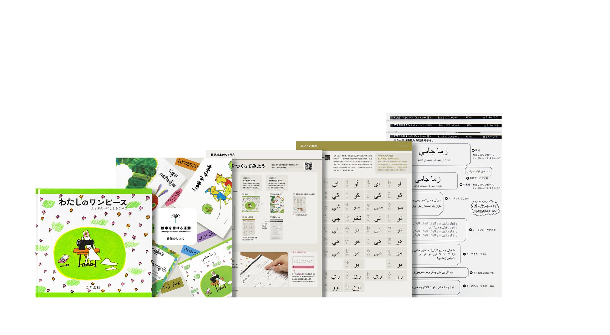 「絵本を届ける運動」に申し込んでいただくと、絵本のほか、「翻訳シール」や「あいうえお表」など、必要なものがまとまった制作セットがお手元に届きます。今回のリニューアルでは、この制作セットに「参加のしおり」を新たに追加し、「参加のしおり」はつくり方だけでなく、絵本を届ける先の言葉と暮らしを学ぶことができる内容になりました。