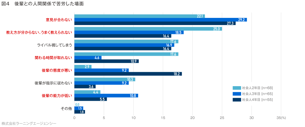 その他、年次で差がついた項目は、「関わる時間が取れない」は2年目が最も高く17.6%で、3年目よりも13ポイント高い結果に。「後輩の態度が悪い」は4年目が最も高く18.2%となり、2年目と15.3ポイントの差が出ました。また、割合は低いですが、「後輩の能力が低い」は3年目が最も高くなり、2年目と6.4ポイントの差が出ました。(図4)