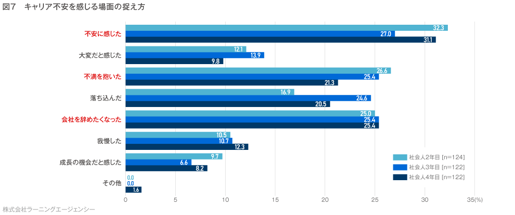 各年次最も高い割合となったのは「不安を感じた(2年目32.3%、3年目27.0%、4年目31.1%)」でした。続いて、2年目の2位には「不満を抱いた(26.6%)」、3位には「会社を辞めたくなった(25.0%)」、3年目の2位には「会社を辞めたくなった」「不満を抱いた」が同率25.4%、4年目の2位は「会社を辞めたくなった(25.4%)」という結果に。各年次の1/4が離職を検討する結果となり、働き続けることへ不安を抱く状況は、上司や後輩との人間関係よりも離職に影響していると推察されます。(図7)
