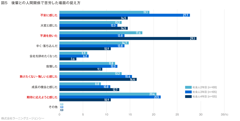 後輩との人間関係の壁は、年次が上がるとともに解消され、また、後輩との苦労する状況を、不安や不満を感じつつも「期待に応えたい」「負けたくない、悔しいと感じた」など、健全な感情とも言える捉え方をしている結果となりました。