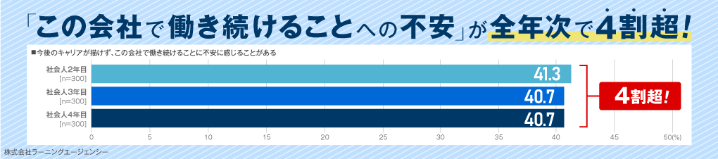 そして、「今後のキャリアが描けず、この会社で働き続けることに不安を感じることがある」については、社会人2年目が41.3%と最も高く、3年目、4年目が同率の40.7%となりました。