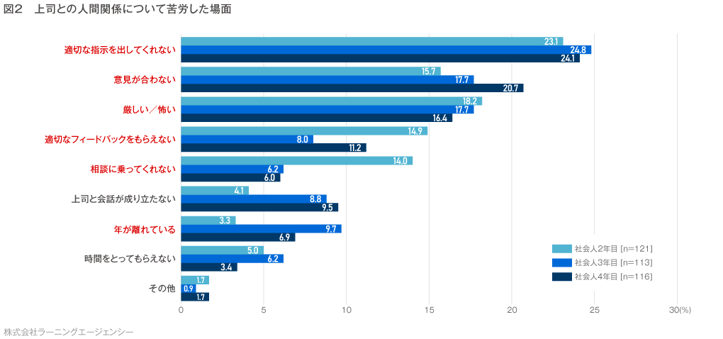 まずは、「上司との人間関係について、苦労したことがある」と回答した人に、具体的にどのような場面で苦労したのか質問しました。結果、「適切な指示を出してくれない」が、各年次最も高い結果となりました(社会人2年目23.1%、社会人3年目24.8%、社会人4年目24.1%)。