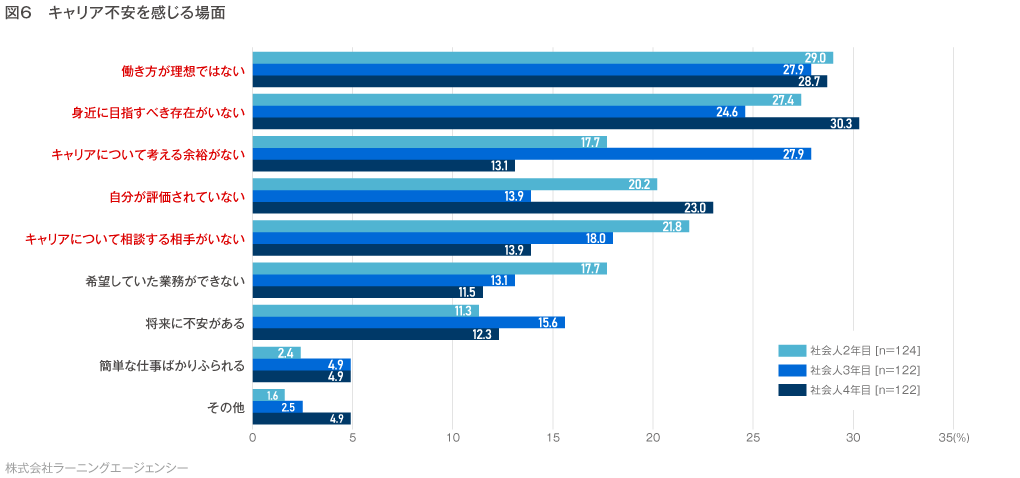 その他、年次で差がついた項目は、「キャリアについて相談する相手がいない」は2年目が最も高く(21.8%)、4年目と7.9ポイントの差、「自分が評価されていない」は4年目が最も高く(23.0%)、3年目と9.1ポイントの差が出ました。(図6)