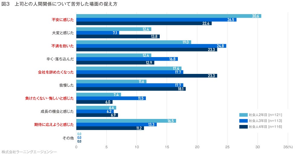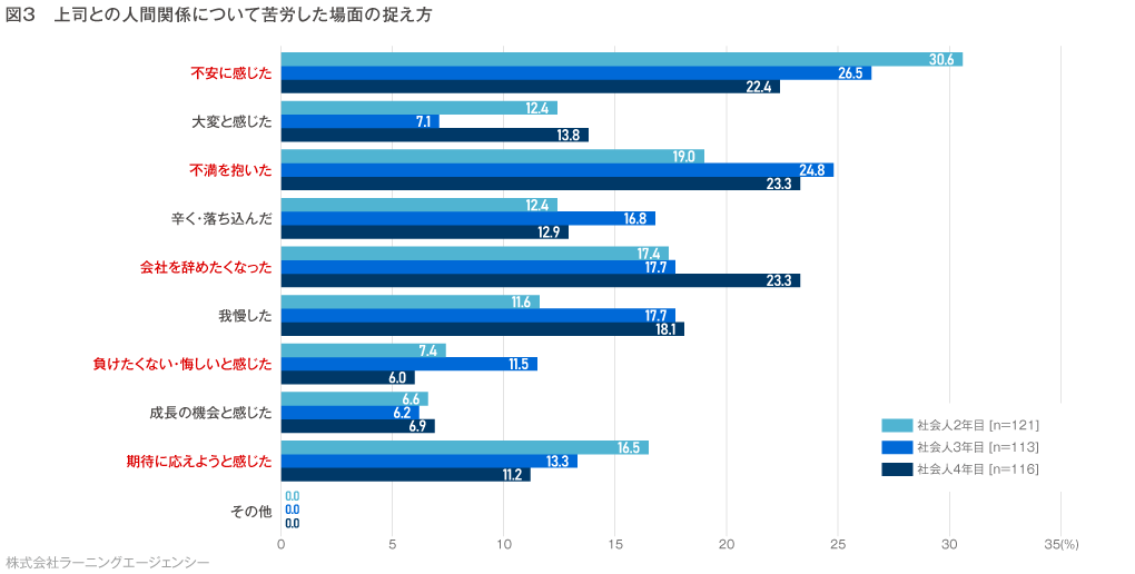 3. 上司との関係で苦労した状況、2、3年目は「不安」に感じ、4年目は「不満」「会社を辞めたくなった」