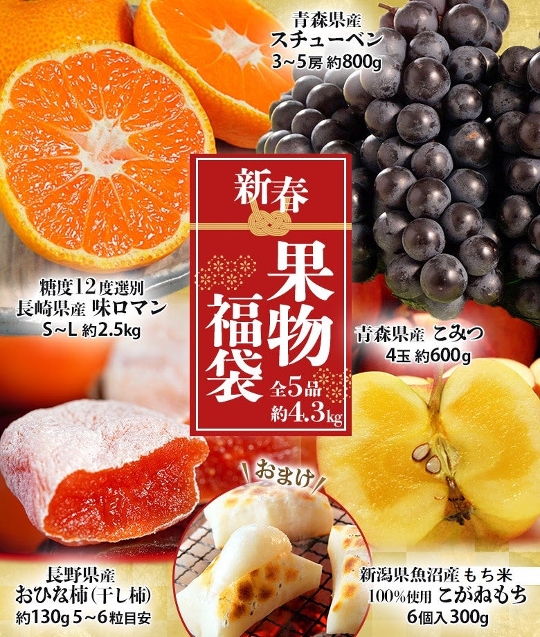 「味ロマン」と「こみつ」が入る特別な福袋!ブランドみかんに冬ぶどう、蜜⼊りりんごと⼲し柿に、杵つき餅がおまけです