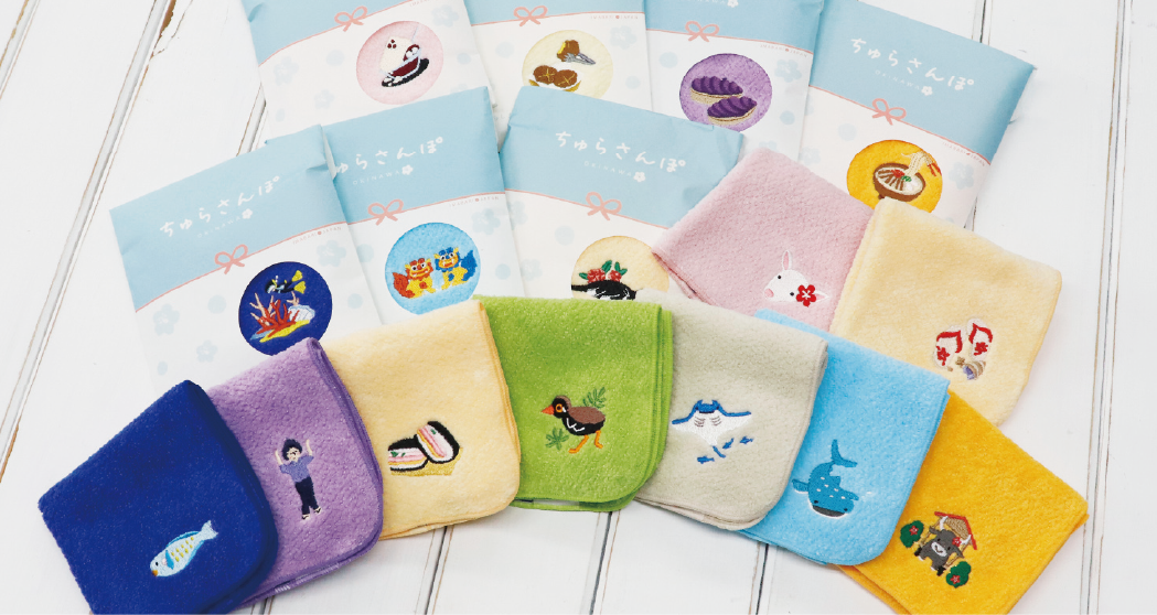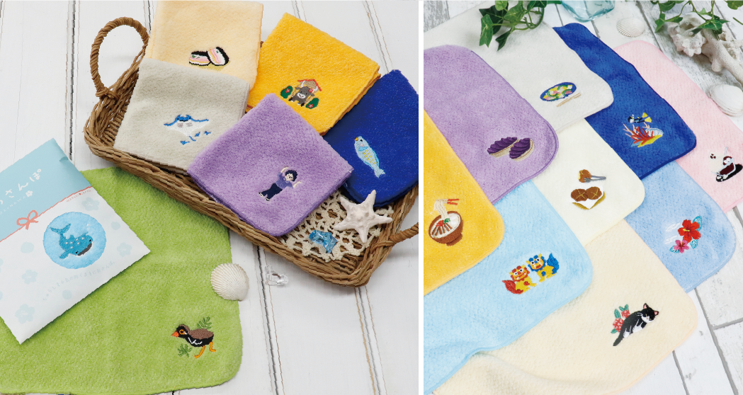 観光客だけでなく、地元客にも人気がある「ちゅらさんぽ」のタオルハンカチ。