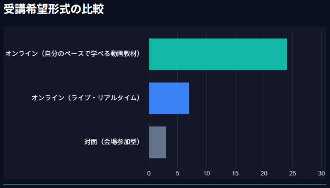 希望する学習形式としては、「オンライン(自分のペースで学べる動画教材)」が24件で最多となりました。また、講座を開講する場合に望ましい形式としては、「録画・テキスト教材の提供」が28件で突出しており、対面授業やライブ配信を大きく上回りました。