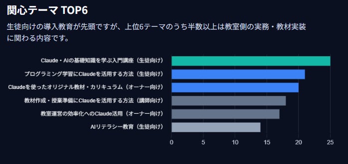 関心の高いテーマでは、生徒向けの基礎知識・入門講座が最多でした。これは、保護者や生徒に対してAIをどう位置づけるかを含め、まずは安全で分かりやすい入り口が求められていることを示しています。同時に、教材作成・授業準備や教室運営効率化、オリジナル教材開発といったオーナー・講師向けテーマにも高い関心が集まりました。