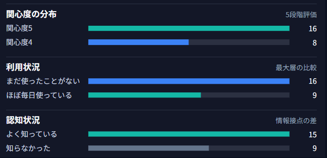 Claudeを活用した講座・教材導入への関心では、5段階評価で「5」が16件、「4」が8件となり、全体として高い期待が確認されました。一方、利用頻度では「未利用」が16件で最多となる一方、「ほぼ毎日使っている」が9件あり、未導入層と先行活用層が併存しています。