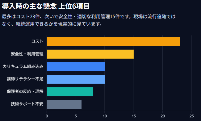 導入時の懸念では、コストが最も大きな障壁として挙がりました。加えて、子ども・生徒への安全性・適切な利用管理、カリキュラムへの組み込み方、講師リテラシーへの不安も上位でした。