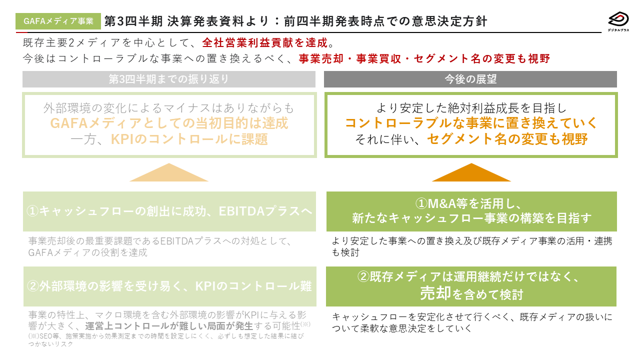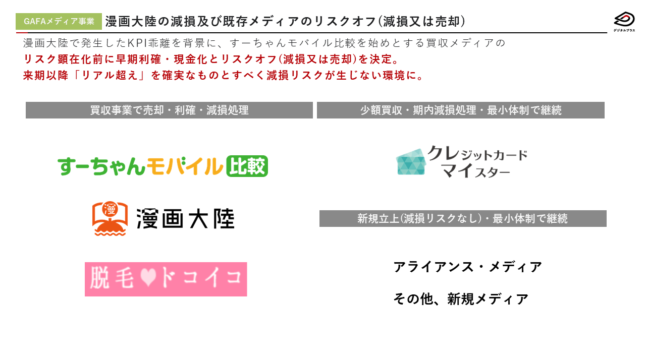 当社グループは2018年度より抜本的な経営改革を決定、推進してまいりました。そのような状況において、新たなる飛躍の為、10年後も成長し続ける生産性の高い新たな事業モデルの創出を目的として、成長市場に当社の保有するテクノロジー、リソースをかけあわせ、高い収益性を実現する新たな事業モデルの構築を目指したGAFAメディア戦略を打ち出し、「GAFAメディア事業」としてメディア買収・メディア運営・メディアの新規立ち上げを行ってまいりました。その結果、メディア買収当初に掲げていた目標である、EBITDA率の向上によるキャッシュフローの改善を実現し、当社グループの中心的な事業のひとつとして大きく貢献をしてまいりました。しかしながら、事業の特性上、マクロ環境を含む外部環境の影響が事業のKPIに直接的に与える影響が大きく、事業運営のコントロールが容易でない局面が発生し、今後も外部環境の影響を受ける可能性が極めて高いと考えております。このような外部環境を踏まえて、より安定した経営環境と絶対的な利益成長を実現することできる事業に一定程度置き換えていくことは不可避であると判断し、GAFAメディア事業が運営する「すーちゃんモバイル比較」、「漫画大陸」、「脱毛ドコイコ」を譲渡することを決定いたしました。