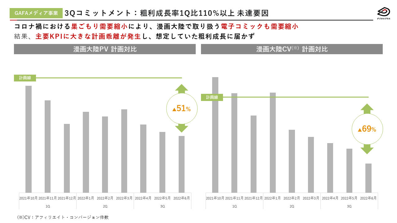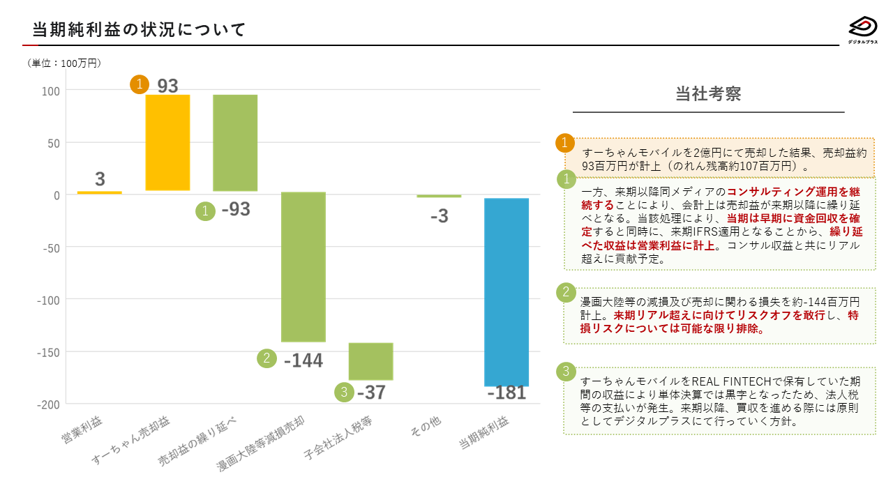 GAFAメディア事業部は、漫画大陸・すーちゃんモバイル比較を始め合計4.21億円分のメディア買収を行ってまいりましたが、その後同メディアの運用を通じて生み出されたキャッシュフロー及び売却による譲渡金額含めた投資回収率は177%超を達成し、期中の収益に大きく貢献しただけでなく、来期以降新たな領域の買収資金を十分に確保することができました。なお、すーちゃんモバイルの譲渡益に関しては、来期に引き続き同メディアの運用コンサルティングを行うこととなっているため、当期の特別利益として認識されず、来期以降に繰り延べられることになりましたが、来期以降は営業利益として認識される予定です。