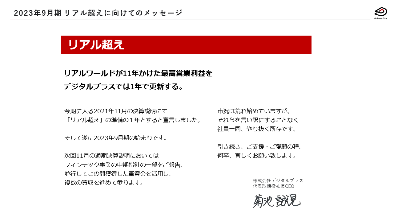 株式会社デジタルプラス(代表取締役社長:菊池 誠晃、本社:東京都渋谷区、東証グロース: 証券コード 3691、以下「当社」)にて、2022年9月期におきまして、2021年11月12日付当社「令和3年9月期 決算短信[日本基準](連結)」において発表いたしました、2022年(令和4年)9月期の通期の連結業績予想を上方修正することといたしました。また、GAFAメディア事業が運営する「すーちゃんモバイル比較」、「漫画大陸」、「脱毛ドコイコ」を譲渡することについて決議いたしました。今後、GAFAメディア事業においてはメディア運営コンサルに加え、マーケティング機能を拡張していき、収益チャネルとしての強化を図ることはもちろん、フィンテック事業とのシナジーも活かして全社におけるマーケティング基盤としての成長を目指してまいります。