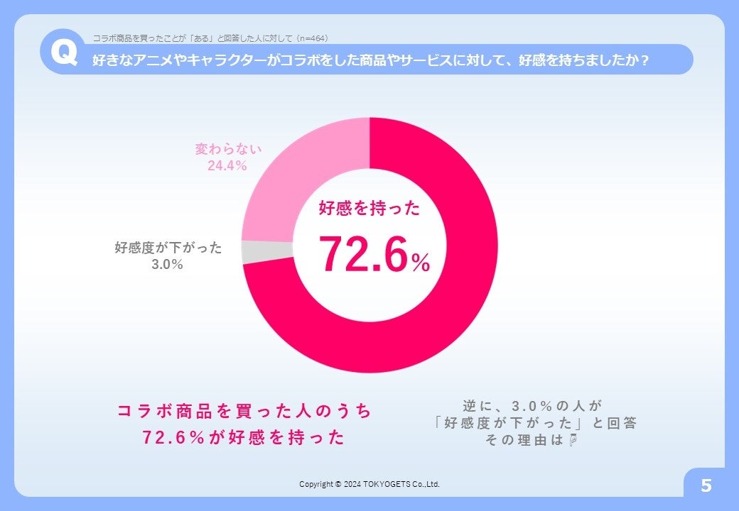・コラボ商品を買った人のうち72.6%が好感を持った一方、3.0%の人が「好感度が下がった」と回答