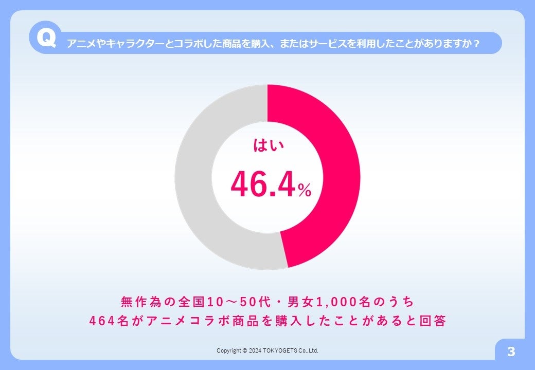「アニメ好き」といった嗜好などを設定しない、無作為による全国10~50代の男女1,000名のうち、464名が「アニメコラボ商品を購入、またはアニメコラボのサービスを利用したことがある」と回答。