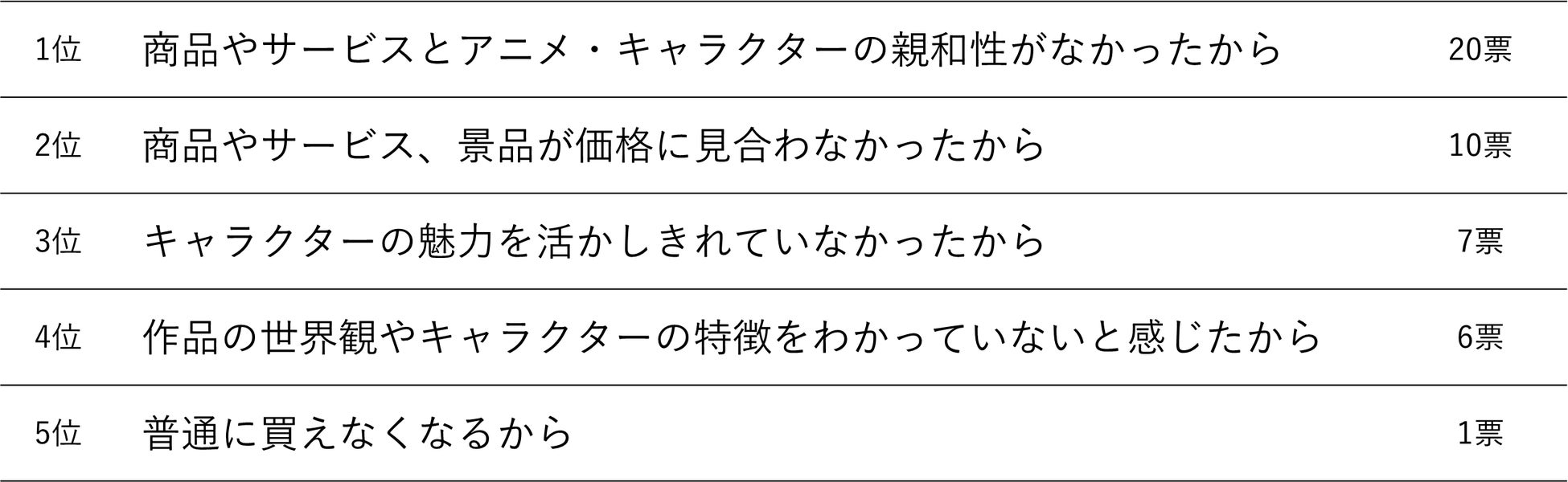 アニメコラボ商品を購入した人は、商品やサービスに対して72.6%が好感を持ち、24.4%が「変わらない」と回答。一方で3.0%の人が「好感度が下がった」と回答。その理由の1位は「商品やサービスとアニメ・キャラクターの親和性がなかったから」。単純に「人気のアニメだから」などの理由で親和性の低いコラボを実施してしまうと、商品・サービスの印象を損ねてしまう危険性があることがわかります。