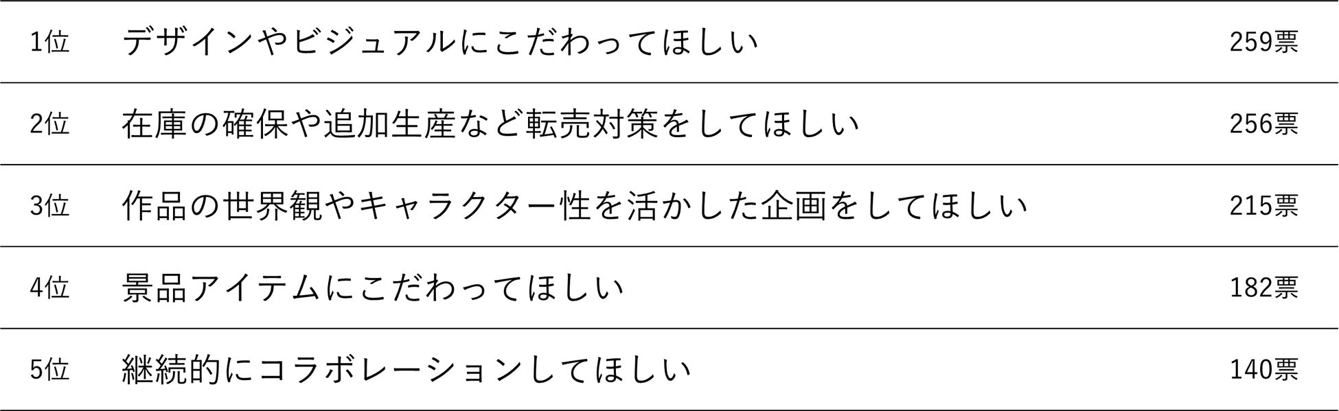 アニメコラボ商品を購入した人が重要視するのは「デザインやビジュアル」。さらに「デザインやビジュアル」とほぼ同じ程度の割合で「在庫の確保や追加生産など転売対策をしてほしい」という声が多く、昨今問題になっている転売行為への対策や、作品ファンや商品・サービスを必要としている人にしっかりと届ける運営上の工夫も同じく重要視されていることがわかります。