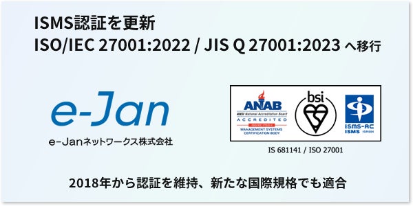 e-Janネットワークス株式会社(本社:東京都千代田区、代表取締役:坂本史郎)は、情報セキュリティマネジメントシステム(Information Security Management System/以下、ISMS)の認証を更新し、「ISO/IEC 27001:2022 / JIS Q 27001:2023」へ移行したことをお知らせいたします。