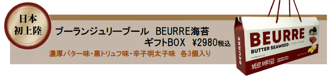 日本初上陸!バターの風味を生かした韓国海苔『BEURRE』の3種類を、焼肉KINTANが日本国内で販売をいたします。焼肉と一緒に、おつまみとして、お子様のおやつとして、様々なシーンで気軽にお楽しみいただける、新しい韓国海苔です。お土産やちょっとしたギフトにもぴったりなギフトBOXも新登場!