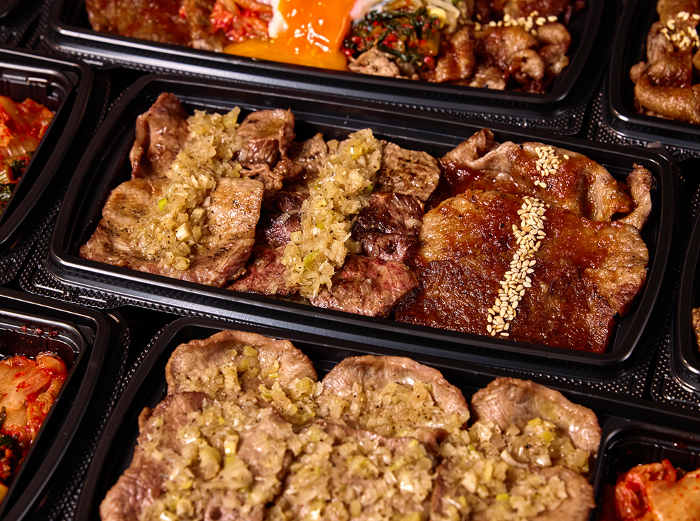 KINTANのお弁当には、さっぱり食べられる自家製のネギ塩ダレ、厳選した甘口醤油をベースに野菜やフレッシュフルーツをブレンドした、風味豊かなKINTAN の特製焼肉ダレをメインで使用しております。どちらもお肉の美味しさを引き立てるだけでなく、ご飯が進む味わいになっております。