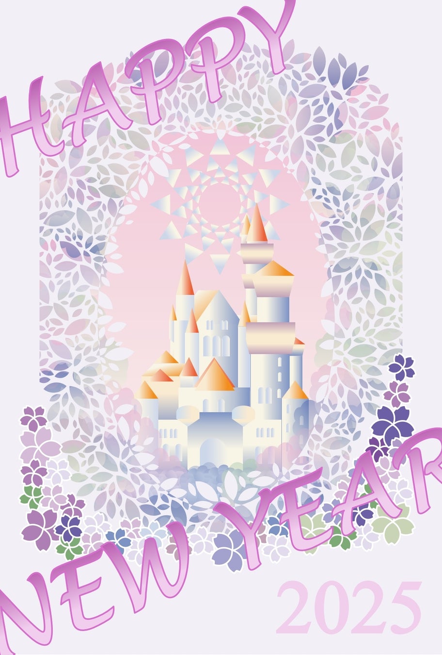 模様すべてを図形で作成しています。お城だけでなく、細かいレースのように見える葉っぱの模様もすべて図形で表現しており、レース部分から覗く部分も背景のグラデーションだけで妥協することなく透明度の高いカラフルな図形を配置することにより、水彩画のようなタッチを表現しています。こだわりぬかれた渾身の一枚です。