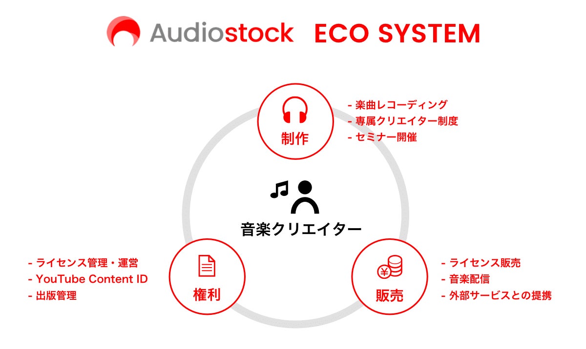 当社は「音楽を生み出す人をハッピーにする」をビジョンとして、クリエイターが適切な収益を得られる環境の構築を目指しており、音楽のライセンス契約~印税分配までワンストップで行うストックミュージックサービス「Audiostock」を通じてクリエイターの創作活動への支援を行っております。